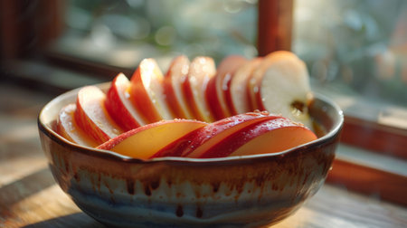 A bowl of sliced apples sitting on a table next to the window, AI