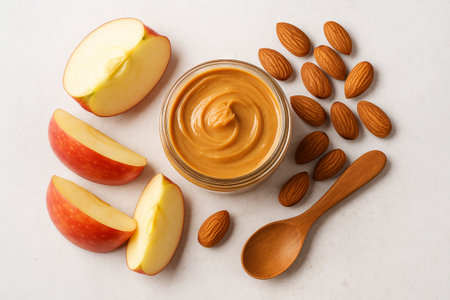Peanut butter and apple slices arranged with almonds on white surface. concept of healthy snack, nutritious food, simple composition.