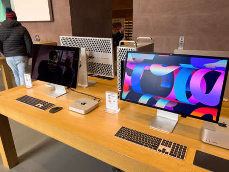 Apple SE 3 smartphone, iPad Air 5 tablet, Mac Studio M1 Ultra, and new Studio Display during the sales launch