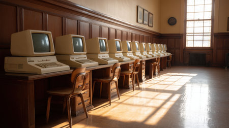 Vintage classroom featuring retro computers and wooden desks, inviting nostalgia with warm sunlight casting shadows. Perfect for themes of education and technology.