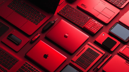 Top-down view of red-themed gadgets including laptops, smartphones, and accessories arranged neatly on a red background, showcasing a bold and modern aesthetic.
