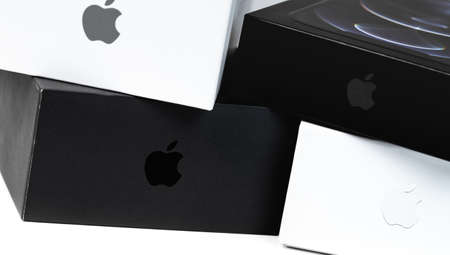 Apple retail boxes closeup, macro. Apple is a multinational technology company. Moscow, Russia - January 14, 2021