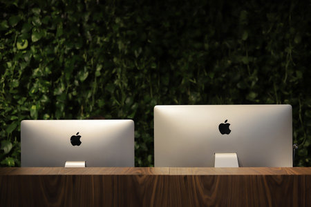 Apple logo on the new iMac colorful 2021 versions the all-in-one personal computer in Apple Computers Store