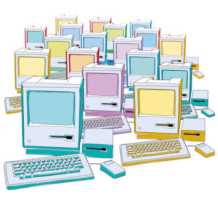Vector illustration with drawing of old computers with keyboard and mouse.