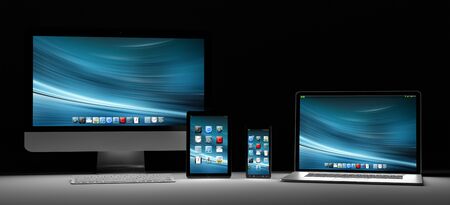 Modern computer laptop mobile phone and tablet in the dark 3D rendering