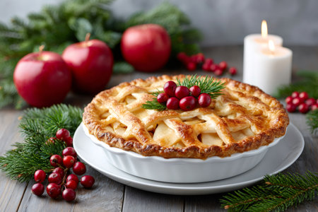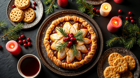 Christmas Pie with Christmas decorations on the dinner table. Xmas decorated pancake.