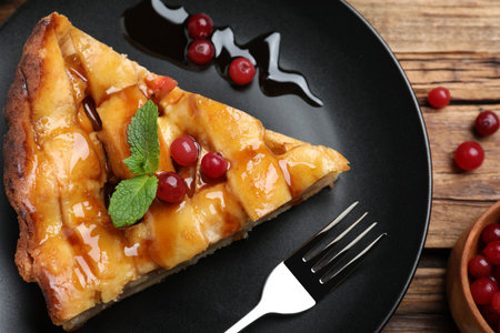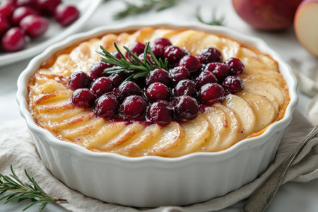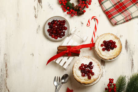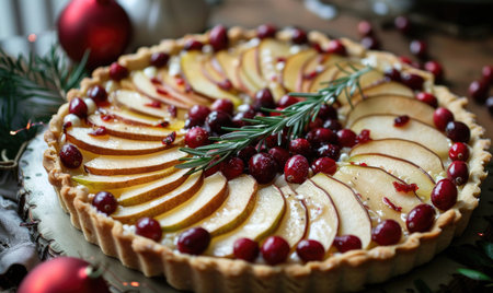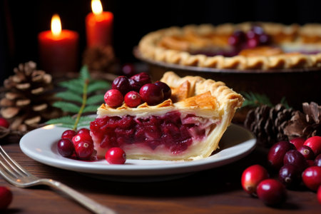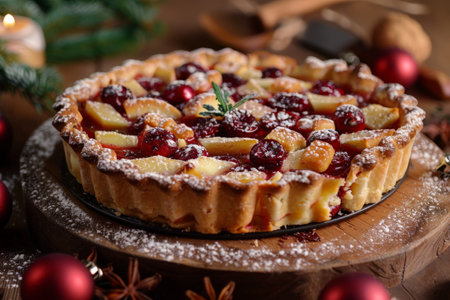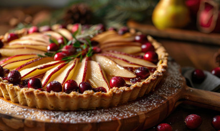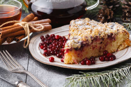 Delicious cranberry pie with fresh cranberries and herbs for Christmas on wooden plate.