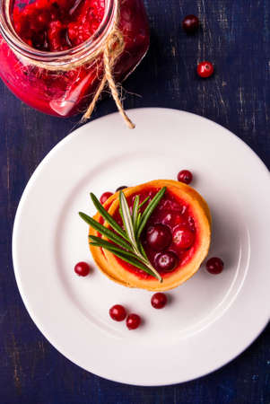 Winter one bite-sized snack or dessert: tartlets with sweet and sour cranberry sauce, decorated with rosemary.
