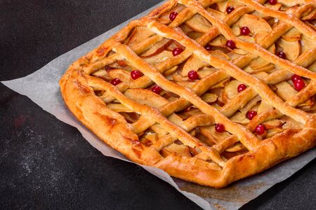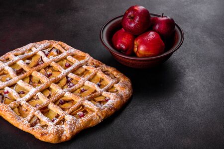 Fresh and tasty sweet homemade apple pie cake with cinnamon sticks, walnuts and apples on side. Placed on stone background.