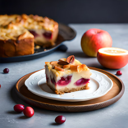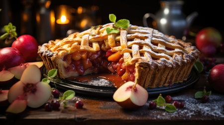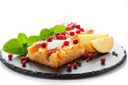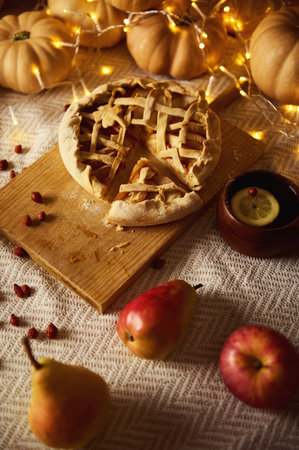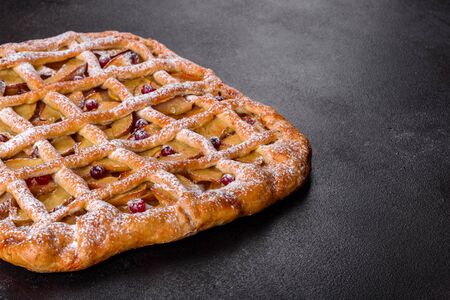 Delicious fresh pie baked with apple, pears and berries. Fresh pastries for delicious breakfast