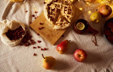 Cozy autumn table setting featuring a lattice pie on a wooden board, cranberries spilling from a cloth bag, apples and pears, and a warm drink with lemon. Soft fairy lights create a festive Thanksgiving mood for family gatherings and seasonal dining.