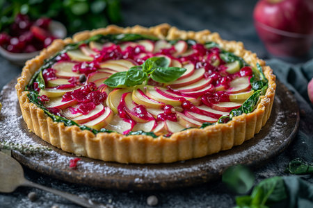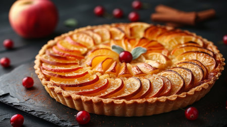 food photography art. apple pie recipe. creative restaurant sweet fruit pizza menu concept