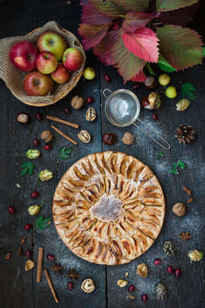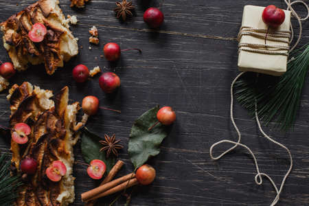 Rustic pie with small apples, cinnamon, anise and pine, top view