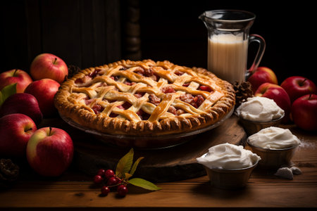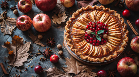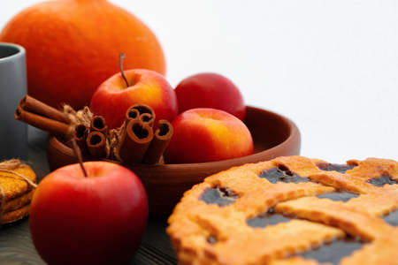 Fall traditional apple pie still life with pumpkin, cranberry and apples