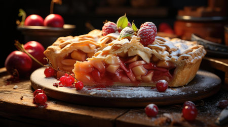 apple pie with cinnamon and raspberry on a wooden table.