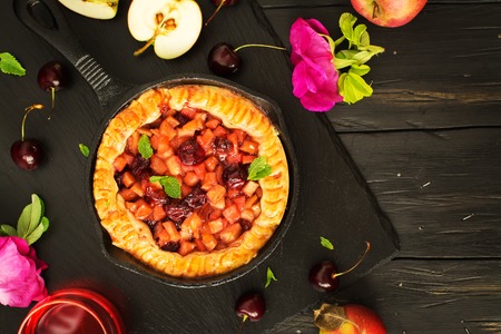 Homemade opened apple and cherry pie in an iron skillet. Top view