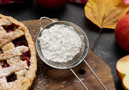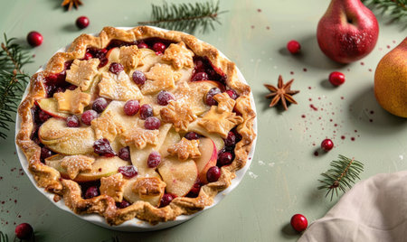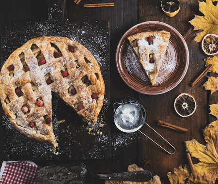 homemade apple pie with cranberry in winter scenery with powder sugar