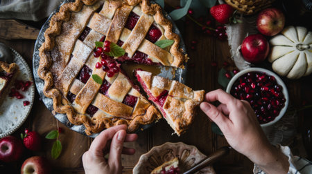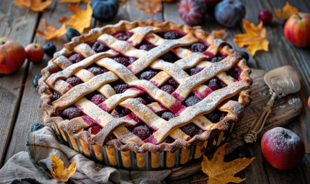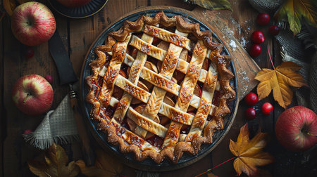 Autumn harvest scene with a lattice pumpkin pie, small pumpkins, apples, and pears on a cozy cloth - perfect for Thanksgiving, family gatherings, and home baking.