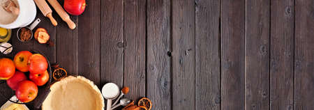 Autumn baking corner border with apple pie ingredients. Top view over a dark wood banner background with copy space