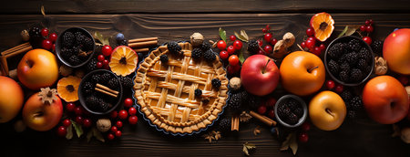 homemade pies, red apples and berries on a brown wooden table