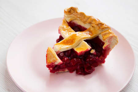 Yummy Homemade Cherry Pie on a pink plate on a white wooden background, low angle view. Close-up.