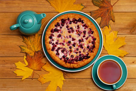 Homemade berry pie and cup of tea on wooden table. Top view.