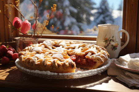 Delicious pie on the windowsill, bright sunny weather pastries and culinary dish. High quality photo
