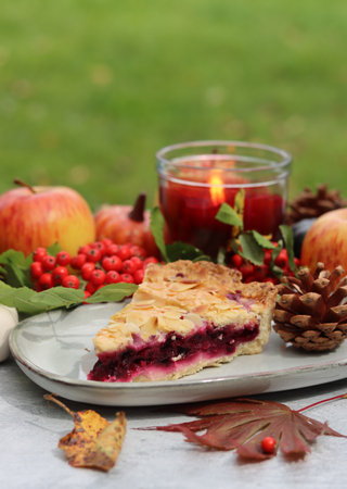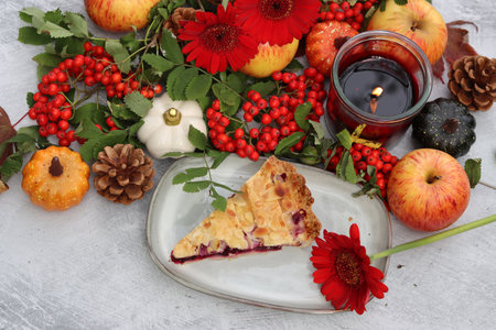 Piece of blueberry pie on a plate with autumn decorations, candle and red flowers. Light grey background with copy space. Cozy autumn food.