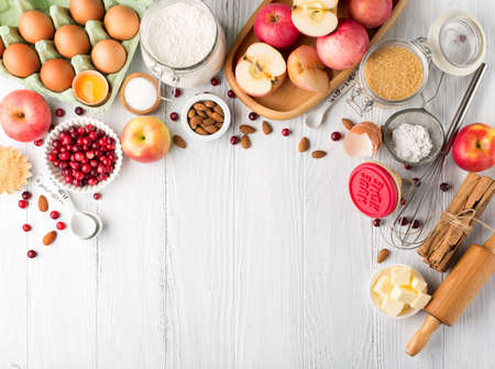 Autumn cooking baking background with sweet apple pie. Traditional american apple pie with fresh apples, cinnamon, spices, baking ingredients, top view copy space on white background