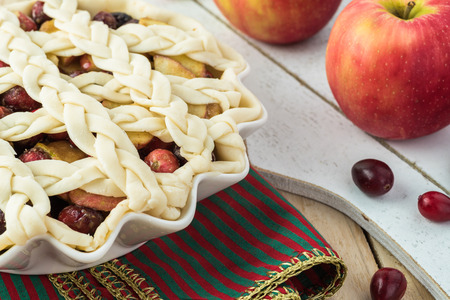 Close up of unbaked cranberry apple pie top decorated with braided crust.