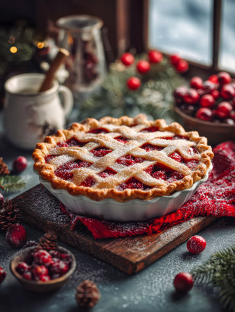 A charming scene features a handcrafted berry pie atop an antique stand, paired with ripe raspberries and festive ornaments, nestled beside a snowy window in a cozy