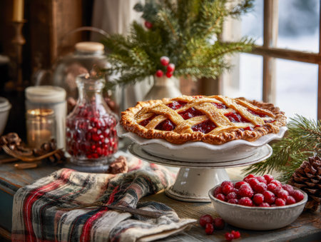 A homestyle cherry pie with a crisscross crust, lightly sprinkled with powdered sugar, sits on a wooden surface amid holiday greenery, ripe cherries, and warm window