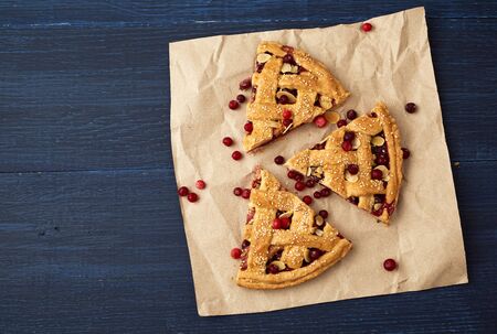 slice pie cranberry. Blue wooden background. Delicious fruit cake.