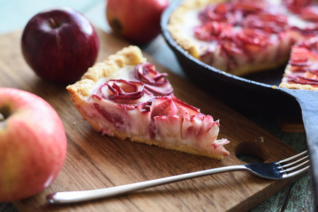 Homemade healthy sweets. Piece of apple rose pie on wooden cutting board served with organic apples closeup