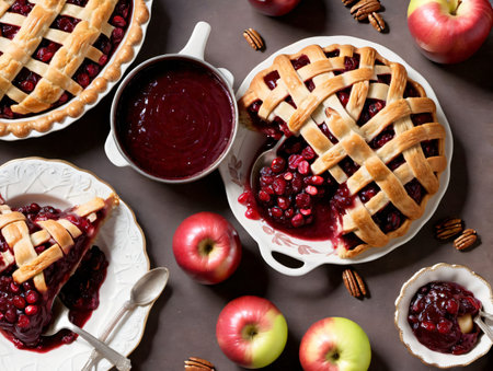 Thanksgiving berry and apple various pies on wooden surface, top view