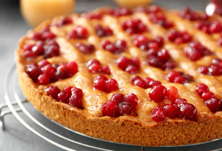 Tasty cranberry pie on table closeup