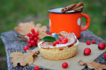 Romantic autumn still life with basket cake, cup of tea, rowan berries and leaves at wooden board