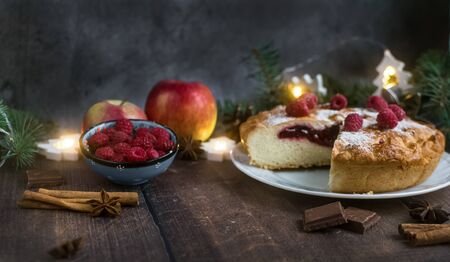 Delicious Christmas raspberry pie with berry filling and icing sugar and spices on a dark background.