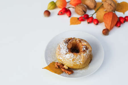 green аpple baked in the oven with cinnamon and honey sprinkled with powdered sugar on a white plate. Step 7.step-by-step instructions. Recipe for baked apples in the oven