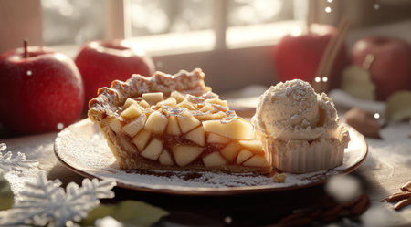 A slice of apple pie with ice cream on the side, surrounded by apples and snowflakes, in a cozy winter setting, rendered in the style of Octane Render. The scene is bathed in soft sunlight through windows, creating a warm atmosphere. --ar 128:71 --v 6.1 Job ID: ca66a79b-d5eb-4117-844e-43381cdceb23