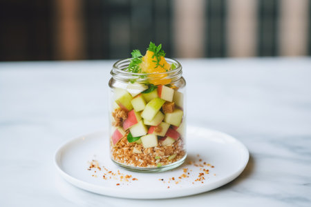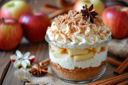 Close-up of a layered apple crisp parfait topped with whipped cream and spices