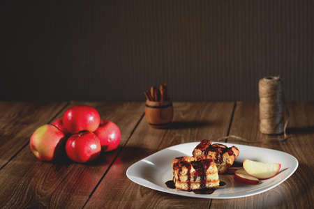 apple pie drizzled with chocolate on a white plate, wooden background, red apple, cinnamon