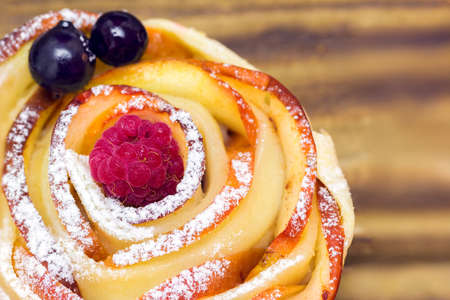 sweet apple pie with white sugar sprinkles on a wooden tray and blurred background