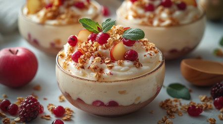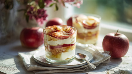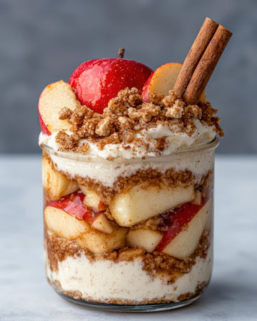 Layers of apple parfait with creamy yogurt, stewed apples, and fresh slices, topped with cinnamon for a healthy breakfast