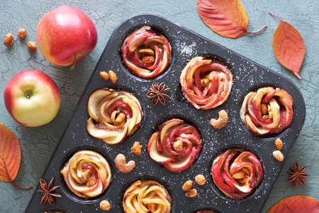 Tray of apple roses baked in puff pastry on gray textured background with Autumn leaves and red apples