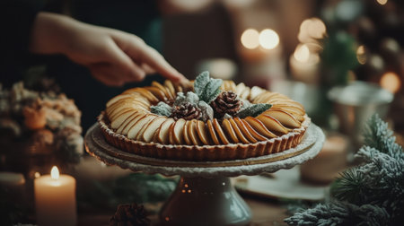 A beautifully presented apple tart sits on a dark stand, surrounded by red apples and lush greenery, creating a cozy and inviting atmosphere perfect for autumn gatherings.