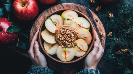 A gorgeous wooden plate features fresh apple slices artfully arranged with nut butter and walnut toppings. Surrounded by vibrant red apples and greenery, this image captures the essence of a wholesome autumn snack. Perfect for food lovers and healthy lifestyle enthusiasts.