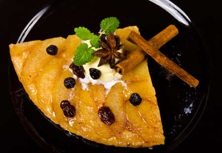 Apple tart with cinnamon and star anise on wooden board, closeup