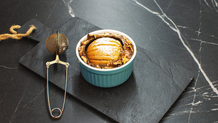 Traditional French sweet dessert : Apple Brioche on beautiful background. One piece. Delicious seasonal breakfast. Oblique view from the top, Selective focus.