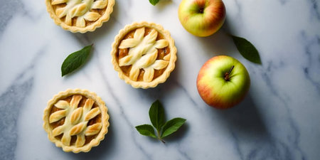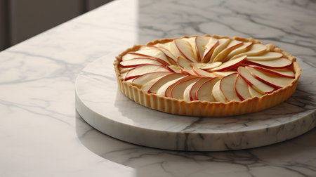 a sliced apple tart elegantly presented on a marble countertop, designed with a minimalist modern style composition or scene